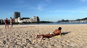 How can you end a tropical vacation without a little naughty, cheating fun at the beach? Travis Yukarin and Hanry Onlyjapa are ready to head back to the States but Travis would like one day of basking on the warm sands of Ipanema. While he's bronzing his muscular Asian body in the sun, hot Cariocas Christin Hupper and Eduardo Menzorra happen by in their tight little bikinis. Offering to slather his back with SPF, Christian nuzzles his hard crotch into Travis' face, then both hot studs begin kissing him. They wander off to the guys' place for someplace more private and conducive to some XXX action.