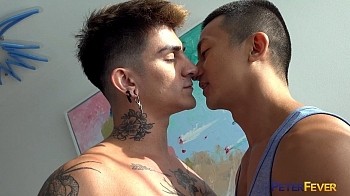 Zed doesn't just want to see, he wants to smell, taste and especially FEEL all the erotic talents Eduardo has to offer. His mouth greedily travels down the dancer's smooth body, then yanks down his shorts to see a huge uncut dick popping straight up. He nurses gently on Eduardo's tool, groaning with delight when Eddie slaps that cock around his face. It only takes a minute before he's seated Median on the couch and climbed up to take his cock in raw and deep.