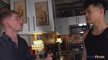 Jason nuzzles Colt's heavy nutsack between attempt to get that giant fucktool down his throat. He takes a break bent over the kitchen counter with Colt's tongue twiddling his chute. His eyes pop wide open when Colt crams his huge rammer in bareback. "Would you fuck me like you did Griselda?" he reminds the married man. Colt wraps a hand across Jason's mouth and pulls him back as he speeds his thrusts. With one foot on the counter, the other on the floor, he finds the perfect position to plow in deeper. By the time he's smacking Jason's meaty ass between strokes, we can see he's ready to blow. He creams Jason's crack when a message comes in threatening "I know what you freaks are up to!" Jason dashes, ass still leaking cum, with a vow not to tell anyone! That promise sounds a little hollow...