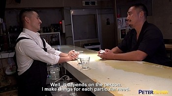 "My diner opens at midnight. That's when the boys stumble out of the bars..." While Chef Daddy sizzles up some savory Spicy Eggplant, handsome politician Nobo sits at the bar to check out the diner, and it's sexy proprietor. Chef Daddy Hiroya moves his hand in just close enough to brush Nobo's as he serves a cool glass of water to accompany the spice. Pulling him closer and planting a deep kiss across his hungry mouth, he remarks "I want to do something political with YOU!" Hands explore each other's taut muscles as Hiroya leads Nobo to a quiet room with a simple bed against the wall.