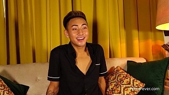 Jeremy loves the feeling of control when he's licking and sucking a dick and giving pleasure to someone. He's excited to be part of a positive Asian sex site like PeterFever and really enjoyed shooting his first series. After the interview, Jeremy peels out of his shirt and slacks and pulls out his stiff cock. He caresses his nips and body, gives his cock a sensuous massage with a vibrating massage gun. Once he lets a finger stray to his round muscular booty, we can see what really revs his motor. Watching a hot scene on his phone, he strokes and milks a hefty load from his tawny dick. Cum splatters across his pubes and tight belly while he groans out his satisfaction. Relaxed and chilled out, he gives a winning smile to the PeterFever audience.