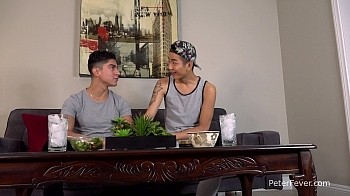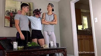 The Devil boy grinds his crotch into Nolan's face, and in no time at all he's naked and riding Nolan's probing tongue. The hot devil reaches down to stroke Nolan's rock-hard cock and gets on his knees to give him a juicy blowjob. Nolan wants more, and peels off his tank top and jersey sweats. "Stepping up the naughtiness," the stripper offers his raw muscular ass for Nolan to plow. Bracing with one hand on the sofa armrest he leans back to pull the bridegroom into a kiss. Nolan tackles him down onto the sofa and rams his bare cock in hard. The two horned-up studs splatter their sperm together across the devil boy's tight-muscled abs. "Go back to Hell, I'm getting married tomorrow," Nolan remarks in jest.