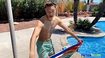 After a cooling dip in the pool, Kai settles down by the fireplace and pulls out his large stiff cock. He wriggles out of his tiny briefs and gets down to the business of stroking. His cock has a big beautiful mushroom head, but he's careful to also take care of his tight little butt. His feet curl back as he fingers the smooth hole. After a few minutes of milking his cock with eyes dreamily closed, he opens them wide and gives us a look that signals something hot and juicy's on the way. "Awww, fuck YEAH! I'm gonna CUMM!..." he announces just a millisecond before a hot splatter sprays out in every direction. His lean abs tighten, drenched in cum. Relax now Kai, that was a hot cum-splosion your inspiration would be proud of.