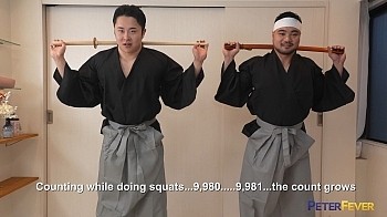 Two more aspiring Samurai meet and spar, muscular macho bottom Rio and stern, stoic Kosuke. Before the battle these two must perfect their swordsmanship, parrying with wooden practice swords. Then come their daily workouts, counting their squats as their bodies dip deep and low, their thick tools and heavy nuts dangling beneath robes and loincloths. When they reach the magic 10,000th rep, they collapse exhausted against the wall. But practice is not over till they complete one more match, a dick fight.