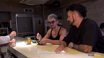 Here we watch sexy silver-haired Daniel Zhang being served a steaming bowl of fresh beef udon as hot Japanese mixed guy Kenji takes a seat next to him at the counter. After cooling off on this hot summer Tokyo night with a cool, refreshing wet towel, he notices Daniel slurping down the delicious noodle soup. Daniel mentions "It's delicious. I highly recommend it," encouraging the conversation. Kenji notices the hot muscular beef of Daniel's biceps as he gets offered a taste of udon. He orders "the same" as they toast their meeting. They agree to go somewhere to discuss working out after they finish eating. Kenji shows no interest in waiting, and takes his steaming bowl "to go".